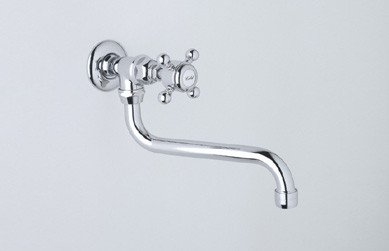 Rohl Brass Kitchen Pot Filler Faucet A1444XTCB2. California AB 1953 and Vermont S152 Compliant. 5-spoke handle. 1/4 turn ceramic valve. 8 27/32 spout reach. Swivel spout. 1/2 female NPT connection. 2.5 GPM. Brass construction. Type: Wall-Mount Pot-Filler Faucet. Handle(s): (1) 5-spoke handle. Available Finishes: Polished Chrome, Polished Nickel, Satin Nickel, Tuscan Brass, Inca Brass (Inca Brass by special order only). Swivel Spout: Yes. Hole Installations: 1. 1/4-Turn Ceramic Valve: Yes. Brass Construction: Yes. AB1953 / S152 Compliant: Yes. Connection: 1/2 female NPT. Flow Rate: 2.5 GPM. Warranty: None (no warranty on Tuscan Brass finish - TCB). Spout Reach: 8 27/32. Spout Length: 7. Vertical Distance Between Handle and Spout: 5 23/64. Base Width: 2 23/32. Hole Size: 1/2 female NPT connection. No longer will the kitchen sink area be thought of in terms of function at the expense of design. ROHL's collection of Country Kitchen Faucets makes a dramatic statement reflecting your appreciation of design as well as function in the most used area of the kitchen. Whether it is a renovated Colonial, a faithfully reproduced Tudor, a cottage on the water, a retro ranch or an urban loft. Your ROHL faucet will be as uniquely distinctive as your sense of style. The selection is distinguished by graceful column country spouts, high arcing C-spouts, porcelain or all metal levers, and nostalgic spoke handles. The faucets are available in Chrome, Polished Nickel, Inca Brass, Satin Nickel and Tuscan Brass. Each faucet combines traditional craftsmanship with state-of-the-art technology and performance.